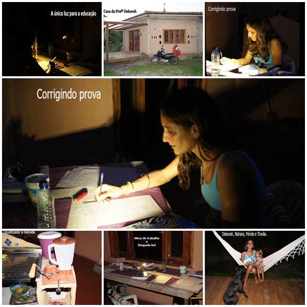 A professora tem miopia. Recentemente foi submetida a duas cirurgias. À noite, planeja e corrige atividades escolares com o auxílio de uma lâmpada de led de 3 watts, ligada a um sistema de captação de energia solar. Antes, trabalhava à luz de velas.