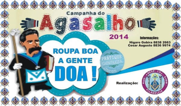 A Loja Maçônica Filadélfia, no 2783, do Oriente de Vitória da Conquista lançou essa semana a campanha “Agasalho 2014”. A ação pretende arrecadar 200 cobertores e roupas, para serem distribuídos a comunidade carente da cidade que sofre com o período de inverno.