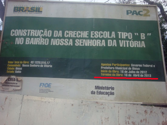 Para quem ainda não sabe, as obras estavam paralisadas há quase dois anos, salvo engano por questões burocráticas envolvendo Governo Federal e Prefeitura, parceiros nesse empreendimento social do PAC. Segundo a placa informativa da construção, o término da obra seria em abril de 2013. Crianças e mães estão perdendo um precioso tempo por conta do grande atraso, fruto da burocracia e sei-lá-mais-o-quê. Não há informação de quando a obra será entregue, pois a placa antga continua no mesmo lugar, ainda informando o prazo de conclusão para abril de 2013.