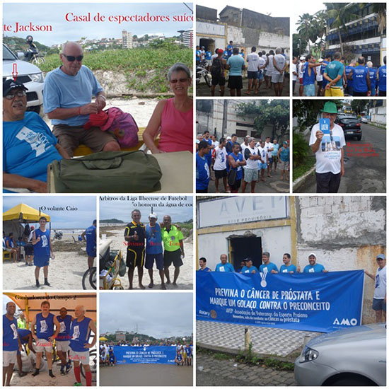 A Avep-Associação dos Veteranos de Esporte Praiano iniciou a 18ª rodada de “babas de praia” de sua Programação 2014, domingo, 23, pela manhã, engajada na campanha mundial de prevenção contra o câncer de próstata. Na concentração em sua sede provisória, com o slogan “Cartão Azul pro Preconceito” os médicos Caio Silvério, Matheus Tannus e Juliano Mota, da AMO(Assistência Multidisciplinar em Oncologia), clínica que teve esta iniciativa, explanaram sobre a doença e a importância de preveni-la – eliminado preconceitos – através do toque retal e do exame de sangue denominado PSA- Antígeno Prostático Especifico. Enfatizaram, evidenciando dados do Inca- Instituto Nacional do Câncer, que se estimou em 69 mil novos casos de câncer de próstata para o ano de 2014, em razão da ausência desses exames preventivos.