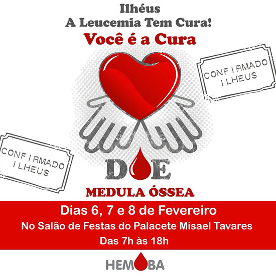 Em parceria com a Secretaria de Saúde de Ilhéus (Sesau), a Fundação de Hematologia e Hemoterapia da Bahia (Hemoba) realizará coleta de sangue nos dias 6, 7 e 8 de fevereiro, sempre das 7 às 18 horas. Os doadores devem comparecer ao salão de festas do Palacete Misael Tavares, localizado na Praça Rui Barbosa, centro, ao lado da Igreja de São Jorge. O titular da Sesau, Antônio Ocké, lembra da importância das doações, uma vez que todo o sangue coletado beneficiará os pacientes nas cirurgias de transplante de medula óssea realizadas no Estado.