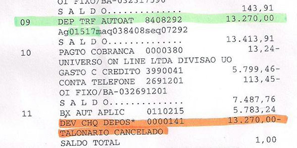 O gerente verificou que na verdade o depósito foi um depósito em cheque em um caixa eletrônico, como se confirmou depois talonário bloqueado por roubo . O cheque havia sido creditado e 03 dias depois, estornado da conta (talão roubado – sustado).
