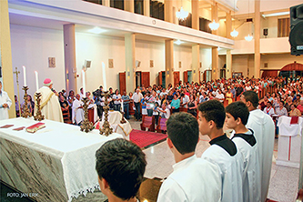 Numa celebração marcada por fortes expressões de fé, devoção, emoção, alegria e lágrimas, milhares de fiéis católicos e devotos de Nossa Senhora da Conceição Aparecida, da Diocese de Itabuna e de diversas cidades do Sul da Bahia, acolheram na noite da última quarta-feira (30/09) a Imagem Peregrina da Padroeira do Brasil, que inicia oficialmente uma peregrinação pelas 33 paróquias da Igreja Particular itabunense, formada por outros 18 municípios sulbaianos. Presidida pelo bispo diocesano, Dom CeslauStanula, e concelebrada por padres do clero local, a Missa Solene de Recepção à Imagem de Nossa Senhora Aparecida teve início às 18 horas na Catedral de São José.