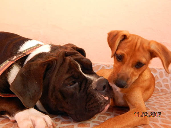 Recentemente, resolvi tomar a decisão pensada e acertada de adotar um cãozinho (dir.) para fazer companhia à minha cadela (esq.). O filhote, idade aproximada de três meses, havia sido resgatado de um porão escuro e fétido, onde sofria maus tratos desde quando nasceu.
