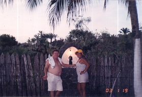 JOSÉ LEITE e sua irmã VERA LEITE ao lado do Pedestal especialmente construído para ser colocada a imagem do PADRE CÍCERO no SÍTIO ALOHA (ILHÉUS).