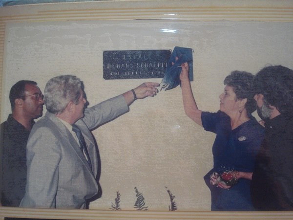 Seis meses depois da inauguração, mais homenagens para HANS SCHAEPPI. Inauguração do SALÃO DE FESTAS com o nome “ESPAÇO HANS SCHAEPPI”. Na foto: JOSÉ LEITE e a saudosa DONA CLARICE SCHAEPPI (esposa de HANS) descerrando a PLACA com o nome do homenageado. Aparece na foto, QUINTO DE SOUZA e BRANDÃO.