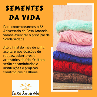 Para celebrar seu sexto ano de funcionamento, a Escola & Brinquedoteca A Casa Amarela escolheu o projeto “Sementes da vida”. O objetivo é trabalhar nos grupos da Educação Infantil e do Ensino Fundamental I os princípios da solidariedade, gratidão, cultura da paz, honestidade, respeito e ética. Como parte das atividades, iniciaram a campanha de arrecadação de agasalhos, cobertores e acessórios de frio que serão encaminhados a projetos e instituições filantrópicas de Ilhéus.
