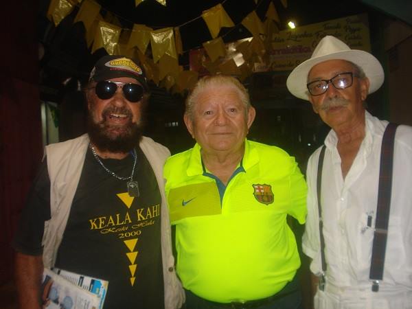 JOSÉ LEITE ladeado pelos amigos MÁRIO QUEIROZ (Jornalista) e RENART (Artista Plástico). (Foto: 29-06-2018).