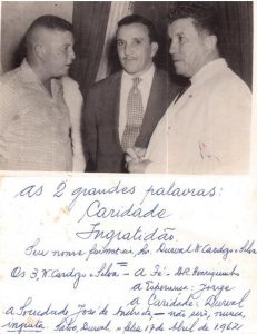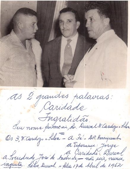Frente e verso de uma foto inédita onde aparecem três irmãos que foram destaques na cidade de ILHÉUS. No centro: Dr. HENRIQUE CARDOSO (foi Prefeito de ILHÉUS 1959-1963 e Deputado Federal 1976-1980) ladeado pelos irmãos JORGE CARDOSO (lado esquerdo) e DURVAL CARDOSO. Obs: Essa foto foi presenteada a DURVAL CARDOSO pelo Presidente da SOCIEDADE JOSÉ DE ANCHIETA, ANTÔNIO SÁ PEREIRA DA SILVA MOREIRA SERVIDOR DA VIRGEM SANTÍSSIMA em 17 de Abril de 1962.