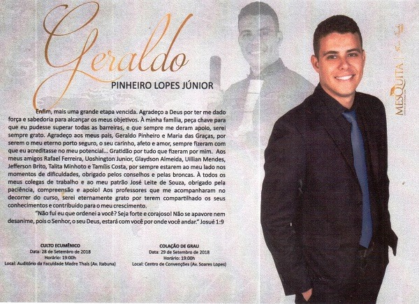 Acontece nesse sábado (29-09-2018) a formatura do jovem GERALDO PINHEIRO LOPES JÚNIOR. A ORGANIZAÇÃO JOSÉ LEITE DE SOUZA sente-se orgulhosa por você participar e colaborar com sua competência, ajudando a nossa Empresa a Crescer. PARABÉNS E UM FUTURO BRILHANTE É O QUE DESEJAMOS!