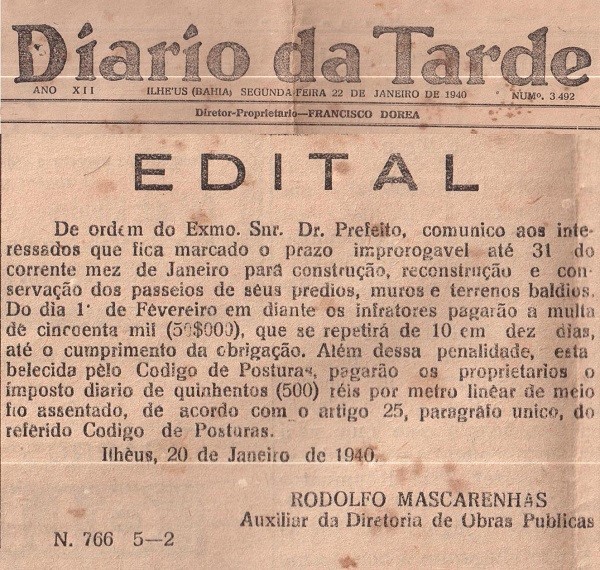 Leia com atenção esse EDITAL acima, publicado pelo saudoso DIÁRIO DA TARDE DE ILHÉUS, edição de 22-01-1940 a 78 anos atrás. A pergunta é: NÃO DEVERIAM SER ADOTADAS ESSAS ORDENS HOJE, DE ACORDO COM O CÓDIGO DE POSTURA DO MUNICÍPIO? FALTA O QUE?
