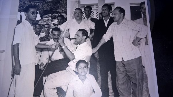 Encontro de amigos na inauguração da FAZENDA OLIVEIRA em BANCO CENTRAL, pertencente ao Sr. CORDOLINO COSME DE OLIVEIRA (CODÓ), grande fazendeiro de ILHÉUS. Na foto, da esquerda para a direita: GILDÁSIO CAMPOS, ARISTON CARDOSO, MÁRIO REIS, FERNANDO GAVAZA, LENINHO FARIAS, ? (Contador da Firma CORREIA RIBEIRO) e QUIRINO CARDOSO (Pai de ARISTON CARDOSO) que aparece na foto pela metade. O garoto é um dos filhos mais jovens do Sr. CODÓ. (Foto: Fevereiro de 1955).