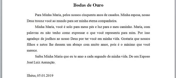 O Sr. JOSÉ LUIZ ASSUNÇÃO e Dona MARIA ASSUNÇÃO são casados há 50 anos e moram na cidade de ILHÉUS. Todo final de ano, JOSÉ LUIZ oferece uma Placa de HONRA AO MÉRITO, gravada com uma bonita mensagem de agradecimento à sua esposa. Este começo de ano (05/01/2018), a festa será muito especial, porque é quando se comemora as BODAS DE OURO (50 anos de casados). JOSÉ LUIZ ASSUNÇÃO e JOSÉ LEITE são amigos há muitos anos e falou: “JOSÉ LEITE todo dia ao acordar, ajoelho aos pés da minha querida esposa MARIA e lhe agradeço pelo amor existente entre nós e nossos filhos e netos”. PARABÉNS para o querido CASAL JOSÉ LUIZ ASSUNÇÃO e Dona MARIA ASSUNÇÃO e todos seus Familiares, desejando-lhes muita saúde e muita Paz!