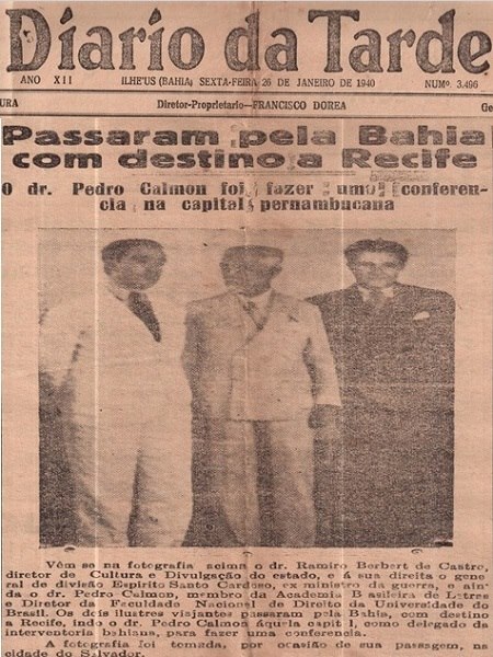 Neste sábado (26-01-2019) está fazendo 79 anos que a Notícia acima saiu na Edição do JORNAL DIÁRIO DA TARDE com a data de 26-01-1940. Lembrando que o Dr. RAMIRO BERBERT DE CASTRO, Diretor de Cultura e Divulgação do Estado da BAHIA, era ILHEENSE.