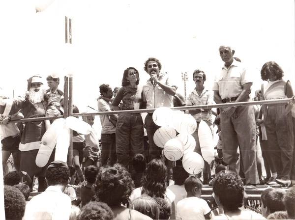 Na foto, FESTA NATALINA promovida pelo CDL DE ILHÉUS na década de 1980, no Estádio MÁRIO PESSOA. Com o microfone ROMUALDO PEREIRA representando a Secretaria de Indústria e Comércio do Estado da BAHIA, ao seu lado “TIA ARILMA” Apresentadora de Programa de Televisão para a Criançada, um sucesso na época. O mais alto é o saudoso Dr. ÁLVARO FIGUEIREDO vice-Prefeito na época.