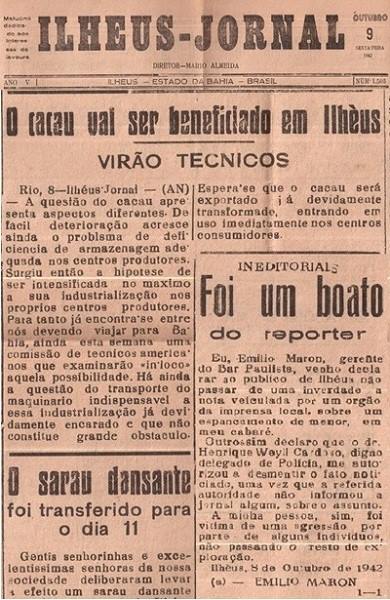 Notícias publicadas na Edição do ILHÉUS JORNAL com data de 09 de Outubro de 1942.