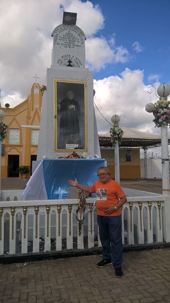 JOSÉ LEITE de frente a Estátua do PADRE CÍCERO que está localizada na PRAÇA DO SOCORRO em JUAZEIRO DO NORTE.