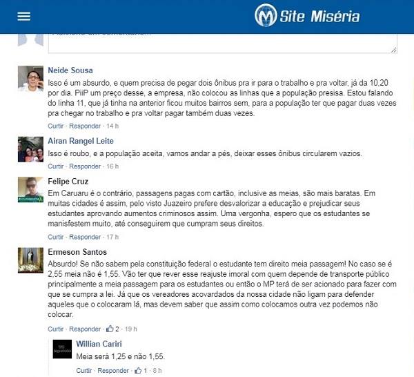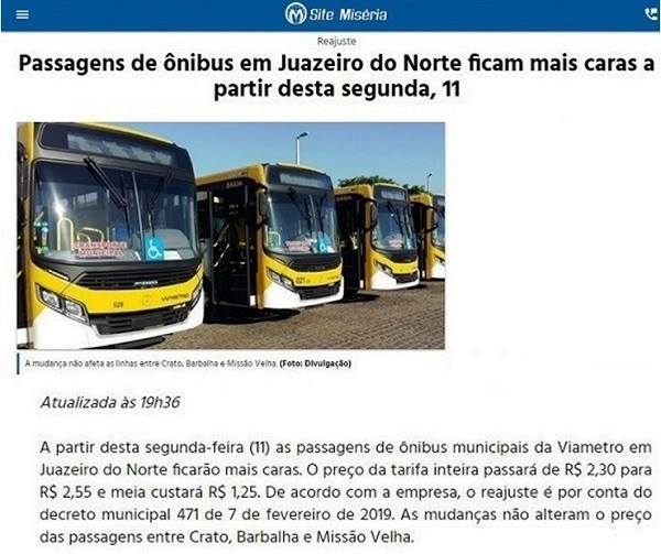 No último “BAÚ” JOSÉ LEITE comentou sobre o Preço da Passagem de ônibus na cidade de JUAZEIRO DO NORTE. Na última segunda feira (11-02-2019), os Preços das passagens ficaram mais caras. Passou de R$ 2,30 para R$ 2,55. Leia a Notícia e os comentários Do SITE MISÉRIA de Juazeiro. Mesmo com um aumento de R$ 0,25 (vinte e cinco centavos), observe os comentários abaixo!
