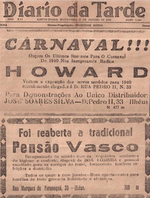 Anúncios de Empresas e Entidades Publicados na Edição do JORNAL DIÁRIO DA TARDE, Edição de 26 de Janeiro de 1940. A única sobrevivente é ainda a ASSOCIAÇÃO COMERCIAL DE ILHÉUS.