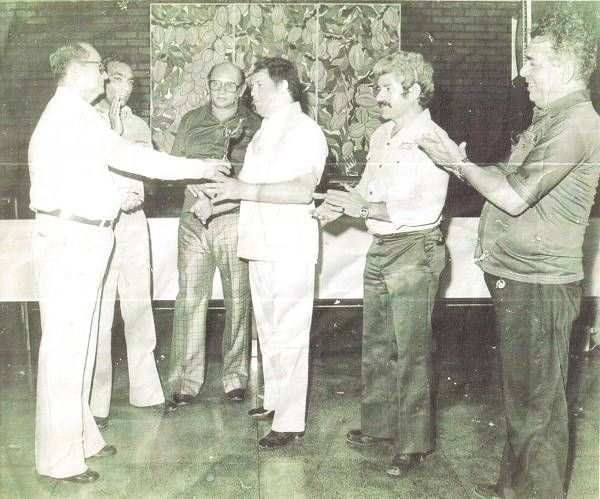 Entrega do Troféu “FAZENDEIRO DO ANO” ao amigo LEANDRO PINILLOS pelo Presidente do INSTITUTO DE CACAU DA BAHIA, na época, o saudoso amigo JOSÉ ALVES DOS SANTOS. Aparece também na foto, da esquerda para direita: Dr. JOÃO HYGINO, MANOEL MACÁRIO, JOSÉ LEITE e o saudoso MYRTES PITITINGA (Jornalista e Radialista). (Foto: década de 1970).