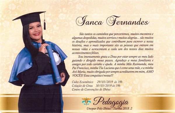 PARABÉNS para a jovem IANCA FERNANDES que neste final de semana, 29 e 30 de Março de 2019, estará se formando em PEDAGOGIA.