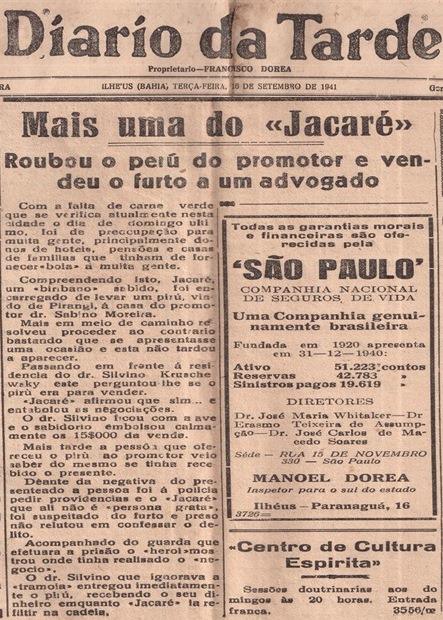 Leia a Matéria acima e conheça uma das presepadas do Biribano JACARÉ. Obs: POTENGI era como se chamava a atual cidade de ITAJUÍPE – BAHIA. Edição do Jornal DIÁRIO DA TARDE de 16 de Setembro de 1941.