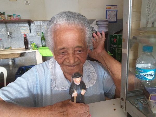 A amiga de JOSÉ LEITE, Dona MARIA (90 anos), irmã do saudoso ZÉ QUITO, segurando a Imagem de PADRE CÍCERO, que JOSÉ LEITE lhe presenteou.