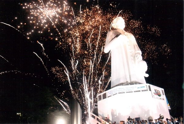 1ª Foto: Estátua de PADRE CÍCERO. Observe um Romeiro subindo a Estátua segurando nos Botões da Batina até chegar ao alto, onde ficou sentado na mão do PADRE.