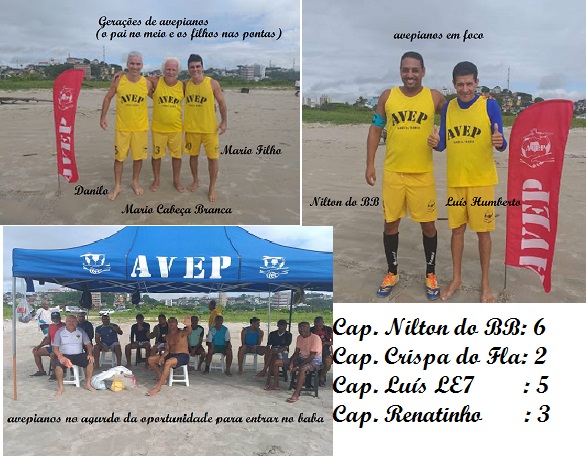 Pela 7ª rodada da Programação 2019 da Associação dos Veteranos de Esporte Praiano –AVEP, entidade de “babas de praia” quase centenária em atividade de Ilhéus, da referida modalidade esportiva realizada domingo (5/V) pela manhã, no Campo Grimaldo a equipe escolhida pelo Capitão Luís Eduardo (LE7) abateu a chamada pelo Capitão Renatinho dos Leais por 5 a 3 com gols de Zezinho da Baixa Fria, Mario Sergio, Luciano Santana(2) e Marconi para a vencedora; Artur Alicate, Charles e Paulo Cesar fizeram para a perdedora. No Campo Martial o time selecionado do Capitão Nilton do BB goleou o optado pelo Capitão Crispa da Galera do Fla pelo placar de 6 na 2. Marcaram Mario Filho(4) e Luís Humberto(2) para o goleador e o próprio Crispa da Galera do Fla e Geraldo da Ceplac (contra) para o goleado. Os ‘babas’ foram disputados na praia da Avenida Soares Lopes, na já tradicional área adjacente ao espaço cultural Tenda Teatro Popular de Ilhéus. Marcaram os juízes Wilson Salviano(Campo Grimaldo) e Edson Miranda sem maiores apelações por parte dos partícipes. Ambos pertencem à Associação de Árbitros de Futebol de Campo de Ilhéus –AAFCI. Levaram Cartão Amarelo: Paulo Cesar; Cartão Azul: Claudio Assis. O Diretor de Baba do dia foi o beque-de-vigor Álvaro Malta, popularmente conhecido como Alvinho.
