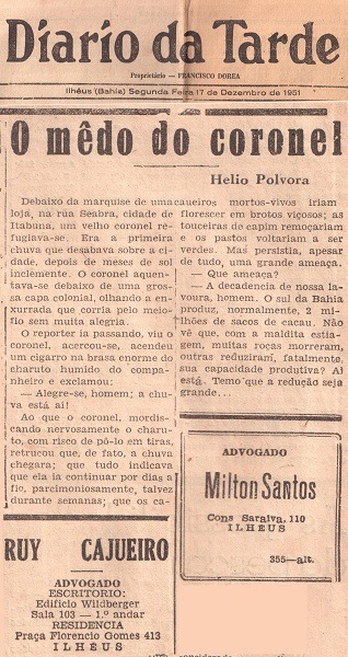 Texto Inédito do Escritor HÉLIO POLVORA, editado no saudoso JORNAL DIÁRIO DA TARDE, edição de 17 de Dezembro de 1951. Destaque para os dois Anúncios logo abaixo: Dr. RUY CAJUEIRO, pai do amigo e Competente Advogado Dr. RUY CAJUEIRO. O outro anúncio é do também advogado e Professor de Geografia no INSTITUTO MUNICIPAL DE EDUCAÇÃO DE ILHÉUS (IME), MILTON SANTOS que tempos depois receber vários Prémios, se destacando Nacionalmente e Internacionalmente.