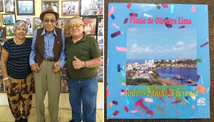 No último sábado, JOSÉ LEITE recebeu mais uma visita, desta vez foi o Sr. PLÍNIO DE OLIVEIRA LIMA acompanhado de sua esposa ADELINA. Acredite se quiser, o Sr. PLÍNIO é cantor e Compositor com 94 anos de Idade. Observe na foto ao lado a CAPA DO CD que o Sr. PLÍNIO gravou em homenagem a cidade de ILHÉUS. O Sr. PLÍNIO nasce em PIRACICABA – SP, mas está passando uma temporada em ILHÉUS.