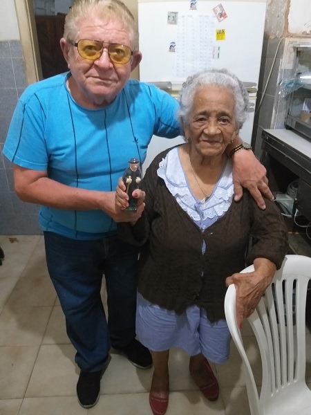 A amiga de JOSÉ LEITE, DONA MARIA OLIVEIRA SOLEDADE, 94 anos, é uma das Devotas do PADRE CÍCERO mais velha de ILHÉUS. Observe na mão de DONA MARIA uma imagem do PADRE CÍCERO que JOSÉ LEITE lhe presenteou. (Foto: 13-07-2019)