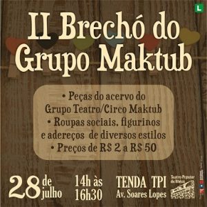 Antes do público cair no riso, das 14h às 16h30 será realizado o II Brechó do Grupo Teatro/Circo Maktub. As vendas serão na Tenda TPI, com preços entre R$2 e R$ 50. Estarão disponíveis roupas sociais, figurinos e adereços de diversos estilos.
