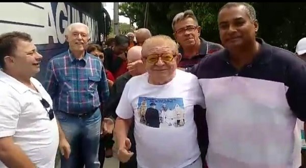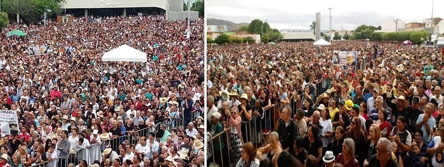 Às 6 horas da manhã do sábado (20-07-2019) foi a vez de participar da celebração da MISSA CAMPAL EM HOMENAGEM AOS 85 ANOS DA MORTE DO PADRE CÍCERO. Observe nas duas fotos, JOSÉ LEITE e JORGE CARDOSO segurando uma faixa no meio da multidão. Foi calculada a presença de 50 mil pessoas presentes na PRAÇA DO SOCORRO para assistir a Missa.