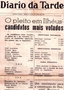 Notícia Publicada na Edição do JORNAL DIÁRIO DA TARDE DE ILHÉUS, edição de 13 de Outubro de 1962. Nesta Eleição realizada no dia 03-10-1962, quem ganhou para Prefeito de ILHÉUS foi o saudoso amigo HERVAL SOLEDADE.