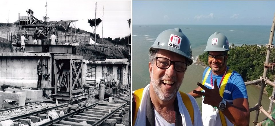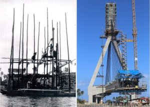 Para se Construir uma Ponte, de porte médio ou grande, na década de 1960, a Tecnologia comparada com a de hoje era quase ZERO. Cimento, Ferro e muita Madeira. Muita madeira mesmo. Naquele tempo, as leis trabalhistas não protegiam o trabalhador como agora e tinha de ser “na mão grande” mesmo. Botas, Luvas, Capacete e Cintos de Segurança só no sonho, e olhe lá. Observe nas fotos abaixo, a construção da antiga PONTE ILHÉUS-PONTAL e a construção da PONTE ATUAL, e observe também a coragem daqueles trabalhadores de 55 anos atrás.