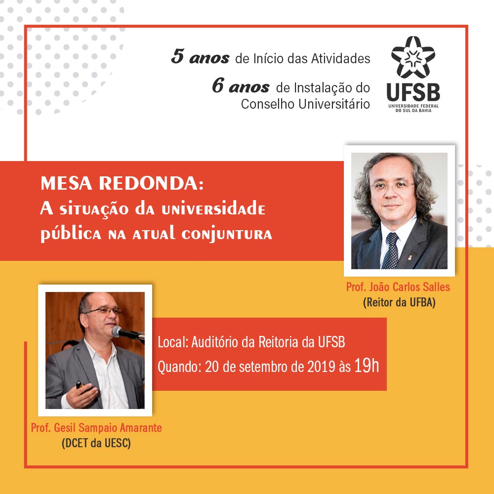 Em comemoração aos cinco anos de Início das suas Atividades e aos seis anos de Instalação do Conselho Universitário, no próximo dia 20 de setembro, às 19 horas, a Universidade Federal do Sul da Bahia (UFSB) realizará a Mesa Redonda “A situação da universidade pública na atual conjuntura”.