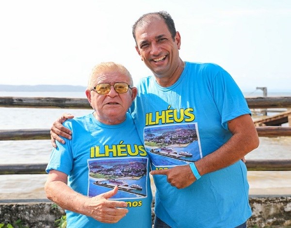 JOSÉ LEITE e o Prefeito de ILHÉUS, MÁRIO ALEXANDRE (MARÃO) no FEIJÃO COMPANHEIRO. Os dois vestidos com a camisa de ILHÉUS, 24 horas por dia.