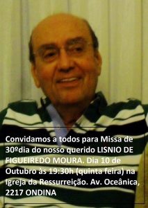 Comunicamos aos amigos de ILHÉUS que, a missa de 30 dias do Falecimento do Saudoso e querido amigo LISNIO MOURA aconteceu no último dia 10 em SALVADOR. DESCANSE EM PAZ AMIGÃO!