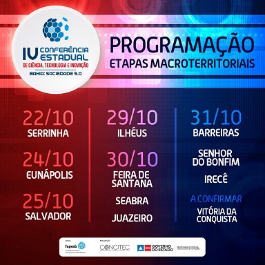 Já estão abertas as inscrições para quem deseje participar das etapas regionais da IV Conferência Estadual de CT&I, realizada pelo Governo da Bahia, através da Secretaria de Ciência, Tecnologia e Inovação (Secti), com o objetivo de elaborar a nova política estadual do setor. Onze cidades baianas recebem entre os dias 21 e 31 de outubro as chamadas conferências macroterritoriais, quando será possível discutir ideias, iniciar debates, entender as demandas locais, bem como eleger os delegados para o evento estadual.