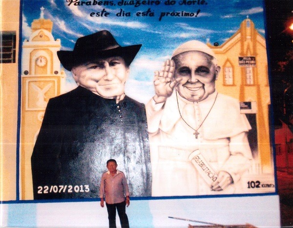 Em comemoração aos 102 ANOS DE JUAZEIRO DO NORTE, JOSÉ LEITE contratou o famoso Ilheense e Pintor Artístico RILDO FOGE para Pintar um MURAL com a imagem do PADRE CÍCERO e o PAPA FRANCISCO. RILDO conseguiu fazer a Pintura em 24 horas, a localização foi num Muro esquina entre a RUA SÃO PEDRO e RUA Dr. FLORO.
