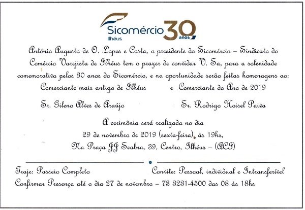 E quem aniversariou nessa última sexta feira (29-11-2019) foi o SINDICATO DO COMÉRCIO VAREJISTA DE ILHÉUS (SICOMÉRCIO). E lá se vão 30 anos. JOSÉ LEITE foi um dos que participaram da sua primeira Diretoria. A data foi celebrada com uma bonita festa no SALÃO NOBRE DA ASSOCIAÇÃO COMERCIAL DE ILHÉUS.