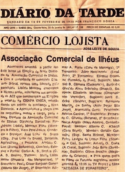 Na década de 1980 e 1990, JOSÉ LEITE escrevia para o JORNAL DIÁRIO DA TARDE DE ILHÉUS. O nome da Coluna era “COMÉRCIO LOJISTA” Leia acima, uma dessas Colunas publicada na Edição do DIÁRIO DA TARDE com data de 25-01-1995 (24 anos atrás).