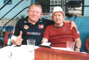 MILTON SILVEIRA, conhecido em ILHÉUS como “ACARI” foi um grande Mecânico, trabalhava na Oficina Mecânica de AURELINO, muito conhecido na década de 1960 e 1970, localizada na Avenida Itabuna. ACARI foi um dos primeiros clientes de JOSÉ LEITE. Em 1960, comprou um par de alianças para noivar e um Relógio para usar. Pagava as prestações semanais para JOSÉ LEITE. Passados 60 anos, ACARI continua sendo cliente de JOSÉ LEITE e nessa quinta feira (08-01-2020), comprou uma armação com lentes na ÓTICA SAFIRA, dividido em prestações. Na foto: ACARI e JOSÉ LEITE mostrando o modelo de tabuleta de quando começou vendendo Joias e Relógios no ano de 1960.