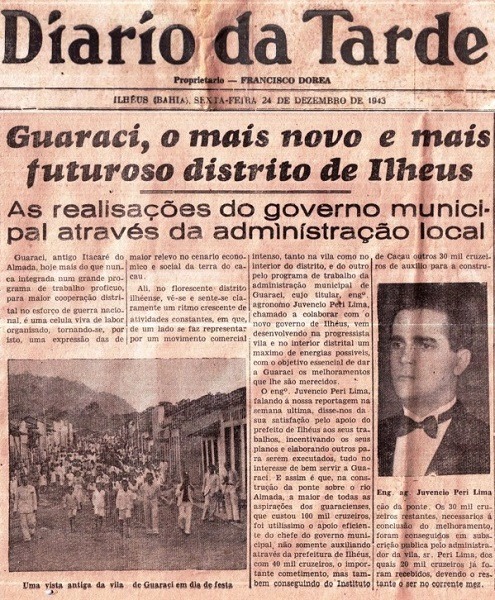 A importância do Município de ILHÉUS na década de 1940. Naquele tempo, Cidades como URUÇUCA, ITAJUÍPE e COARACI eram Distritos de ILHÉUS. Sem falar em ITABUNA, que até 1911 também era Distrito de ILHÉUS. E a cidade continua encolhendo. Foto: Edição do Jornal DIÁRIO DA TARDE DE ILHÉUS de 24-12-1943.