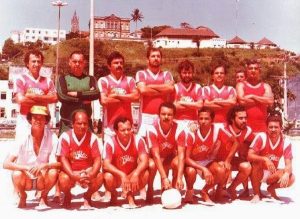 Uma das fotos de times de Praia que JOSÉ LEITE gosta mais, onde aparecem vários amigos. Agora veja o lindo colorido desta foto, onde se ver a Torre da Igreja de NOSSA SENHORA DA PIEDADE, o PALÁCIO DO BISPO (está precisando de uma reforma) e as lindas CABANAS DO MIRANTE ainda coberta de Piaçava, antes do incêndio. (Foto: década de 1970).