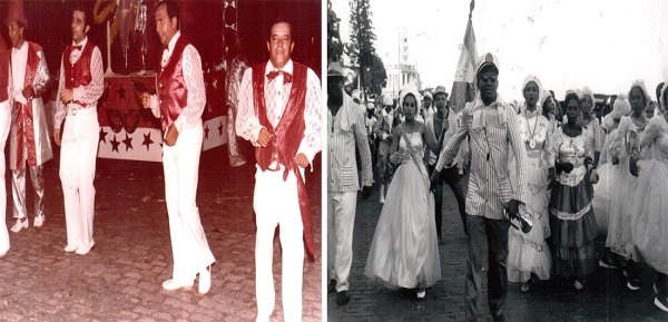 1ª Foto: Desfile da ESCOLA DE SAMBA (VERMELHO E BRANCO) do OUTEIRO SÃO SEBASTIÃO na Avenida Soares Lopes. Na foto da esquerda para a direita: MUNDINHO PINTO, BEL ZAIDAN, NIZAN LIMA e o grande GUERRINHA. Vivo hoje só NIZAN LIMA. (Foto: década de 1970).
