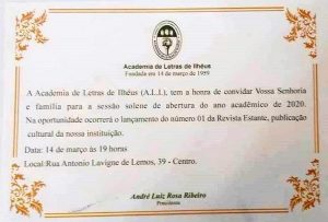 Convite da ACADEMIA DE LETRAS DE ILHÉUS recebido por JOSÉ LEITE. Infelizmente nesse dia (14-03-2020), o homem estará em JUAZEIRO DO NORTE.