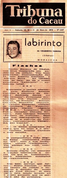Na década de 1970, o amigo saudoso jornalista GILBERTO SABOIA, mantinha uma Coluna no JORNAL TRIBUNA DO CACAU. GILBERTO SABOIA também foi gerente do JORNAL DIÁRIO DA TARDE DE ILHÉUS e Presidente, por vários anos, do KENNER CLUB DE ILHÉUS. GILBERTO SABOIA foi um dos homens que ajudaram a cidade de ILHÉUS a crescer. Na foto, uma parte da Coluna LABIRINTO, escrita por GILBERTO SABOIA no JORNAL TRIBUNA DO CACAU, edição de 21 de maio de 1973. (Clique na foto para ampliar).