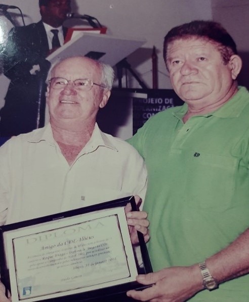 O amigo ROQUE FRAGA recebendo uma homenagem, “AMIGO DA CDL” das mãos de JOSÉ LEITE DE SOUZA. (Foto: 31-01-2003).